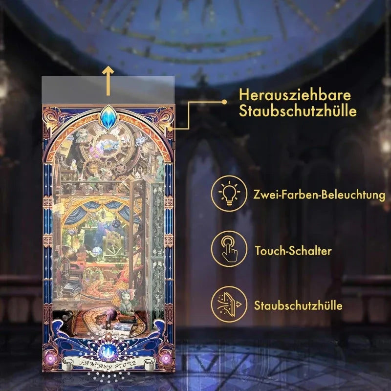 Book Nook - Fantasy Store to czarujący Book Nook, który przenosi Cię do bajkowego, magicznego świata. Zainspirowany tajemniczym sklepem pełnym magii i fantazji, zręcznie łączy starożytne uliczki z nowoczesnymi, fantastycznymi elementami. Każdy szczegół ukazuje świat pełen przygód i tajemnic. Czy to realistyczny magiczny kot, czy zagadkowy zegar – wszystkie one przekazują nieograniczoną fascynację opowieściami fantastycznymi. Ten Book Nook nie tylko nadaje Twojej półce z książkami mistyczną atmosferę, ale pozwala zanurzyć się w świecie pełnym cudów.